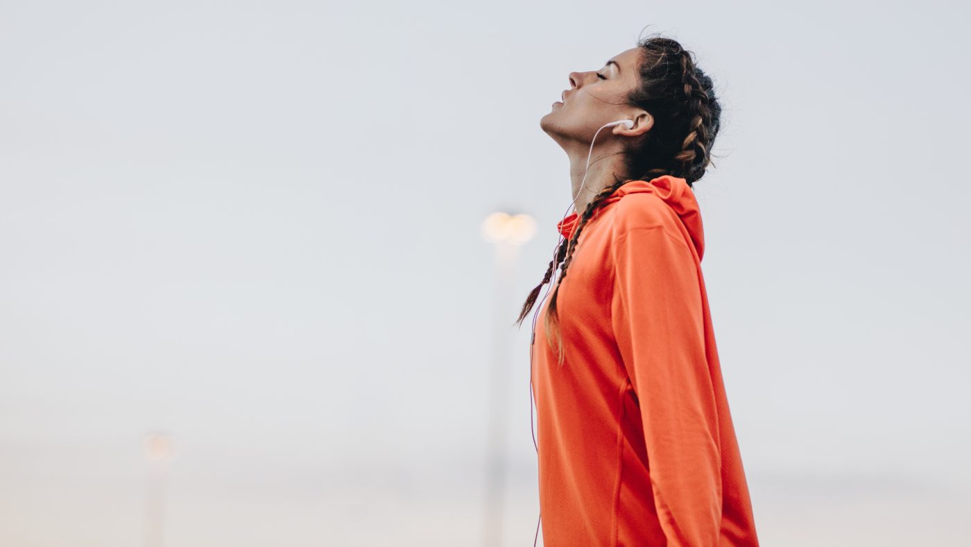 Side view of woman listening music with earphone while having training break outdoors. Female having workout break outdoors.