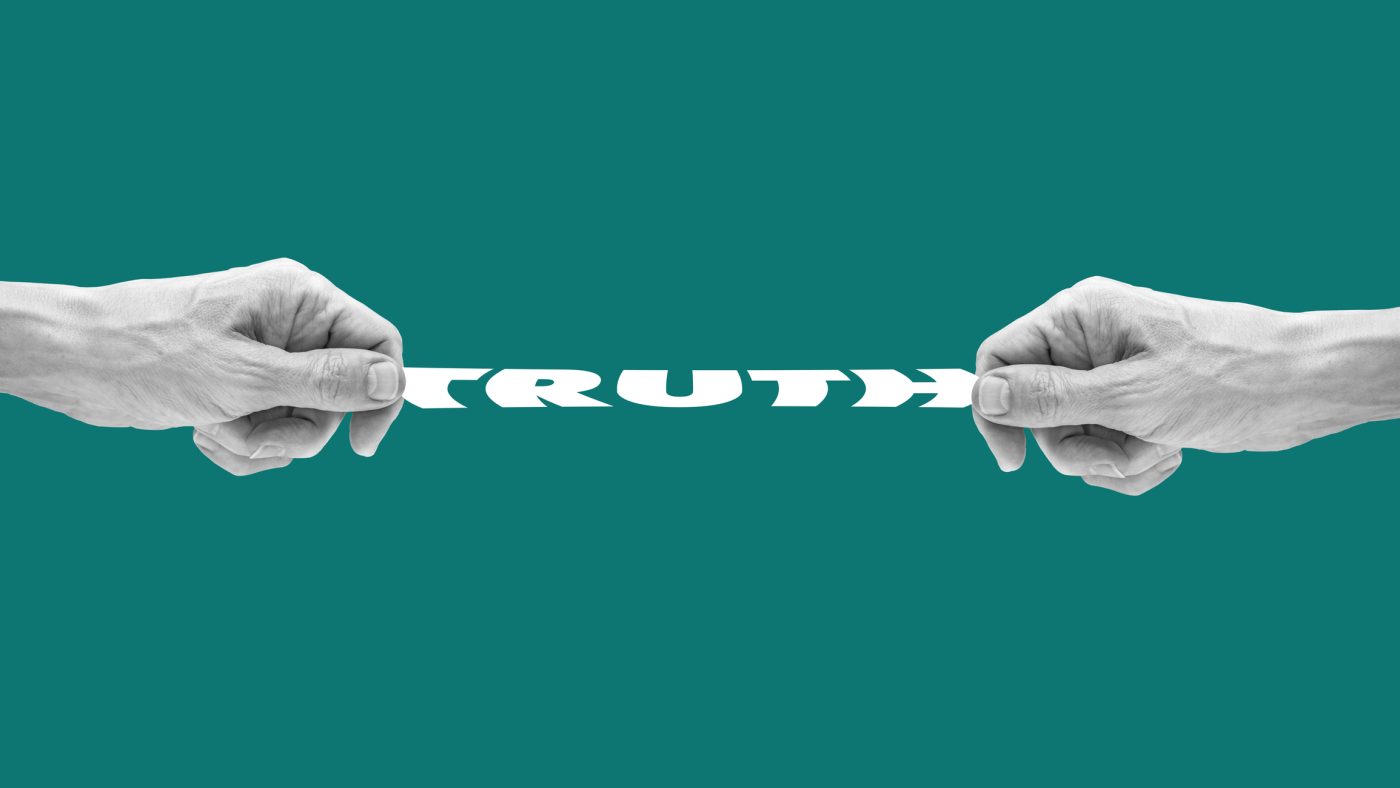 Hands stretching the word “truth”