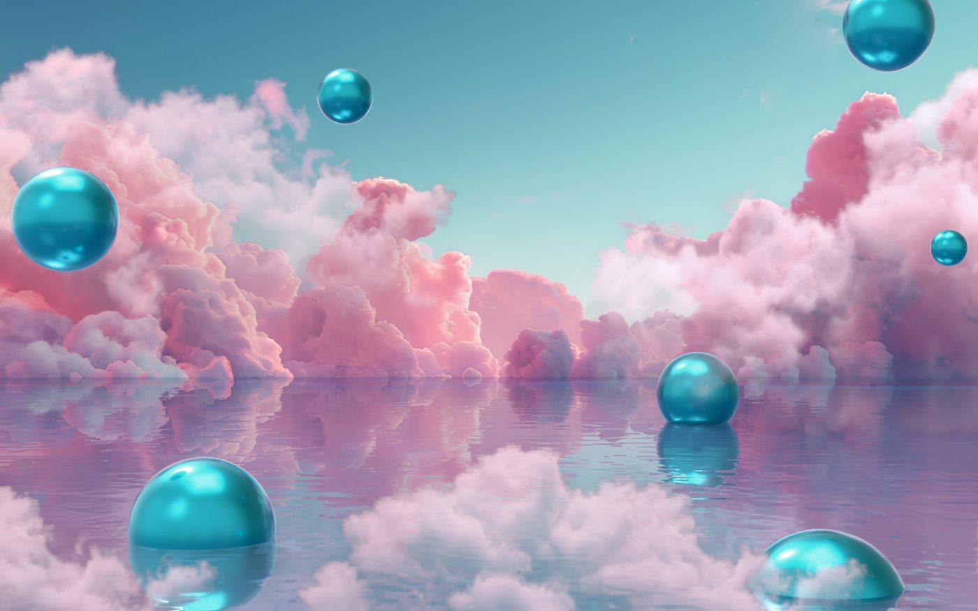 3D rendered image of meta verse with water, beautiful sky, many spheres and unnatural landscape. Different bubbles against magenta cyan blue sky with large fluffy clouds. Surreal futuristic background. New world of Internet, virtual, augmented reality, nostalgia, ethereal magic world, future technologies