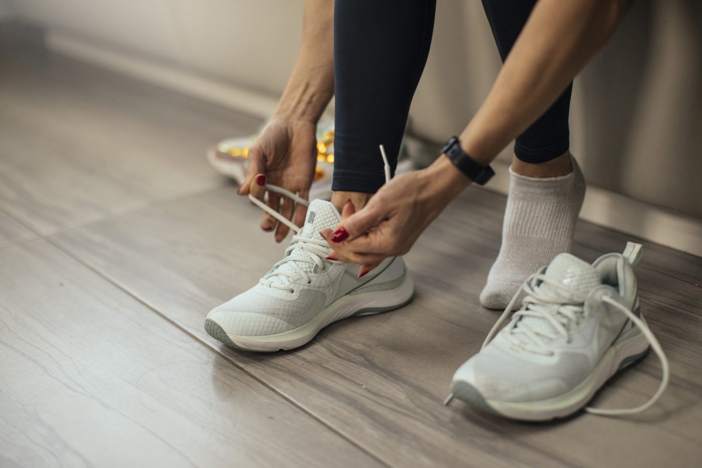 Middle-aged woman preparing for workout and changing to workout sneakers