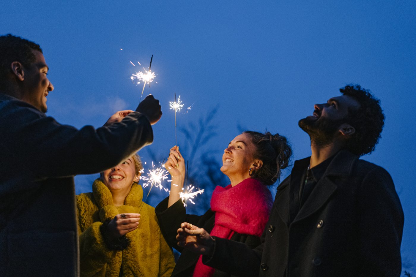 Group of four young adults standing outside in winter, smiling and looking up at the sky with sparklers in their hands