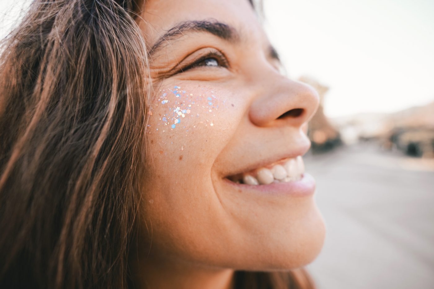 A funny wide angle portrait of a cute young woman with glitter sprinkled on her cheeks. Positive emotions, optimistic attitude, and humor